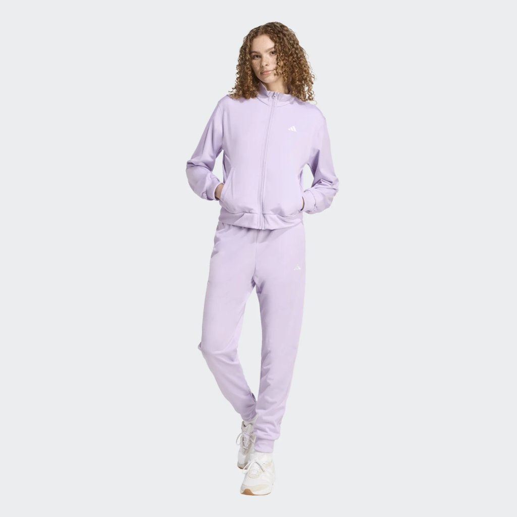 Tepláková súprava z kolekcie adidas. Model vyrobený z hladkej látky. Polyester poskytuje väčšiu odolnosť proti pokrčeniu. V jemne levandulovej farbe.